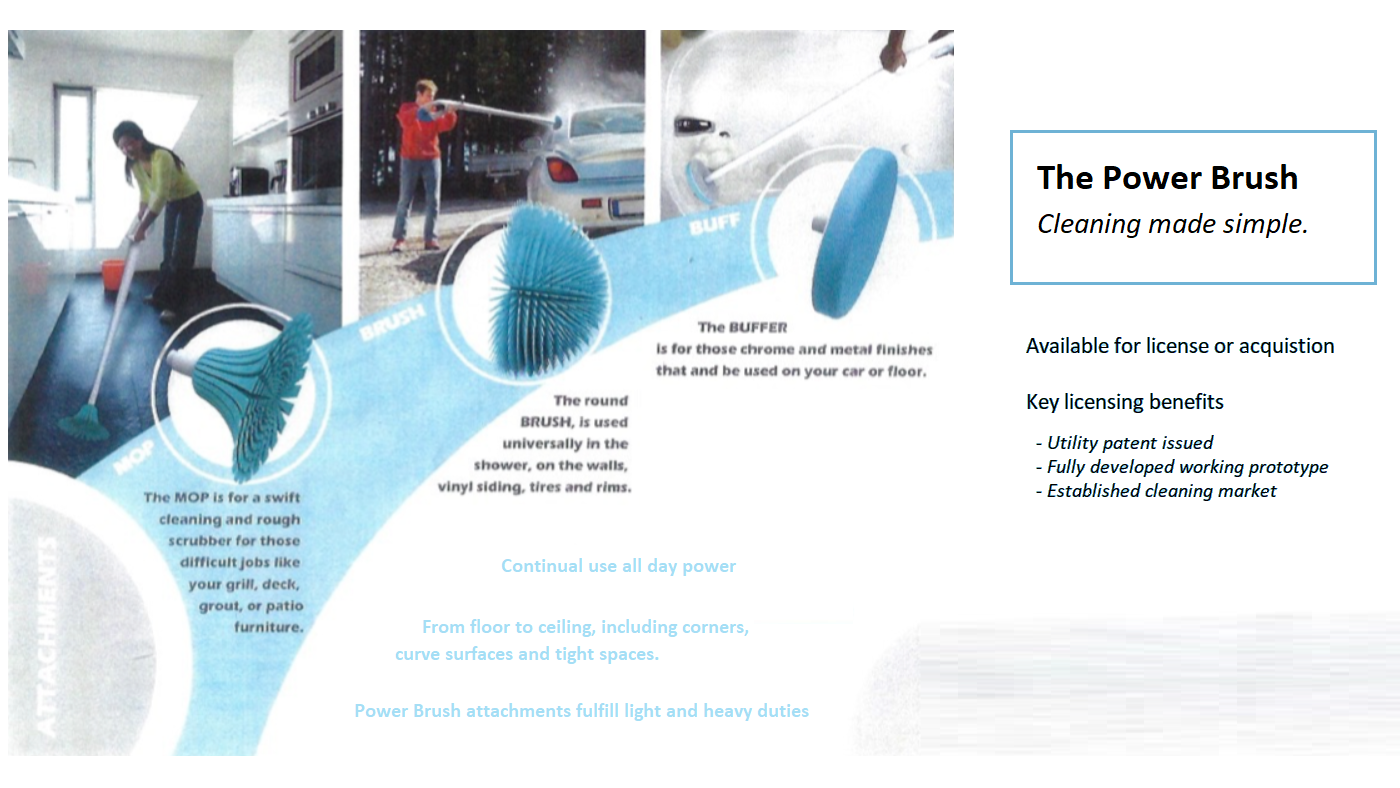 Power Brush is a power tool design for cleaning. Like inventor George Ballas gas powered Weed Whacker. Power Brush is a new way to clean with power tool engineering to whack away soap scum, mold, lime rust, dirt etc. like weed whacker a big bristled ball, cone shape brush with all types of head attachments for Indoor outdoor.